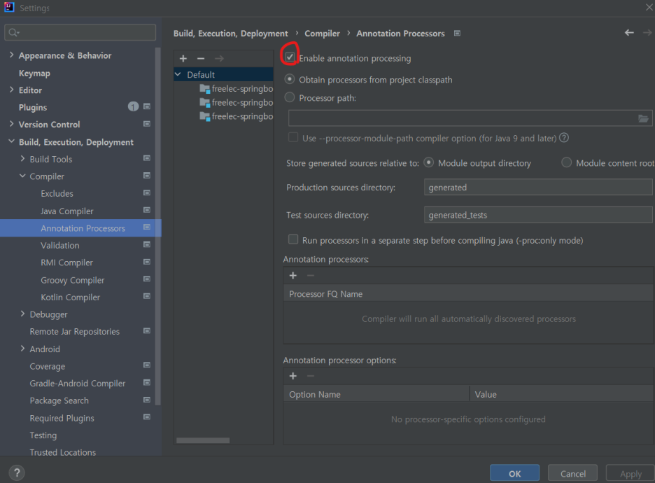 ( 경로 : File | Settings | Build, Execution, Deployment | Compiler | Annotation Processors)