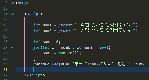 문제 3. 시작할 숫자와 마지막 문자를 입력하고 더하고 콘솔값으로 보여줘라(1,10 -> 1+2+3+4+5+6+7+8+9+10)