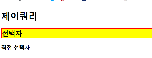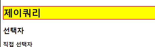 - 제이쿼리 선택자는 css 선택자와 마찬가지로 디자인 속성을 적용할 때 사용할 수 있으며, '동적' 스타일을 적용할 수 있다.(<->HTML - 정적)