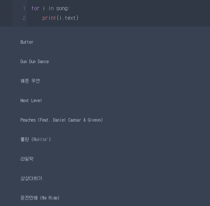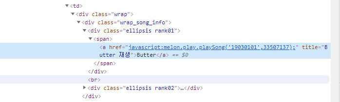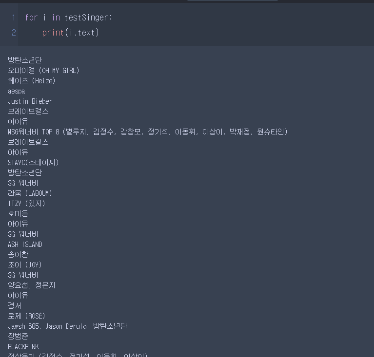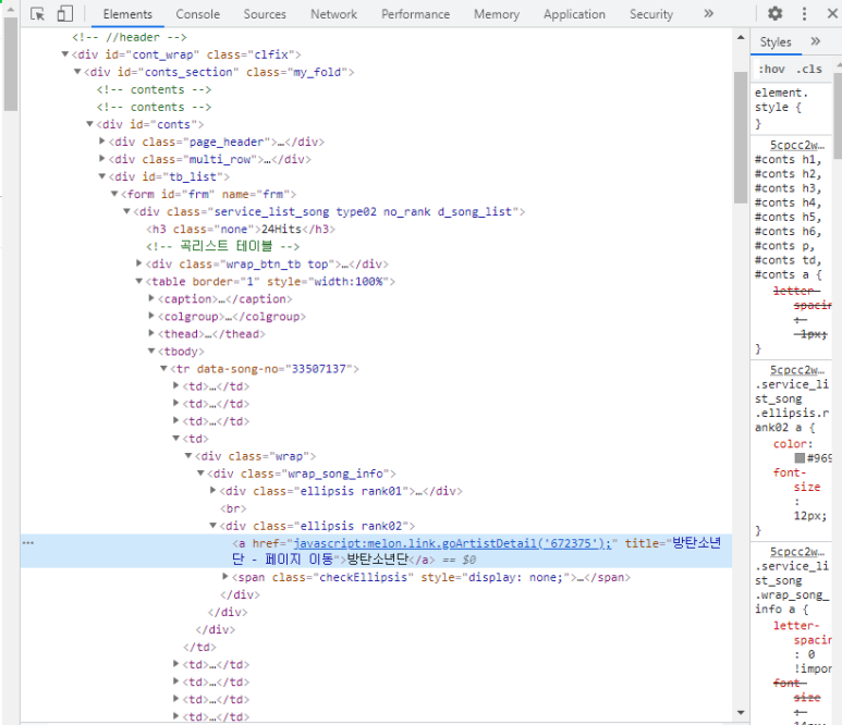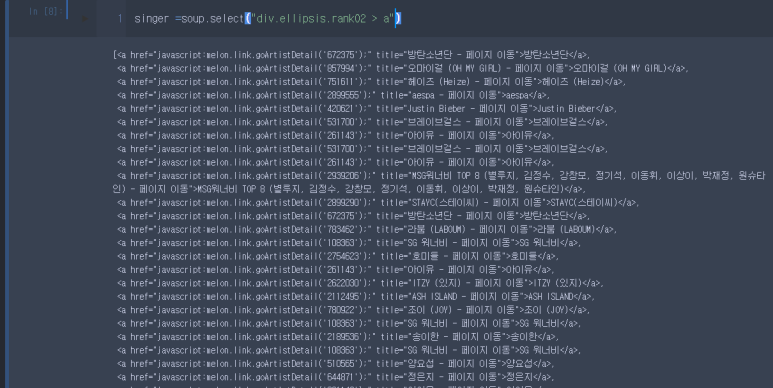 soup.select("div.ellipsis.rank02 > a") 로 값을 확인하고 singer 변수에 담아줍니다.