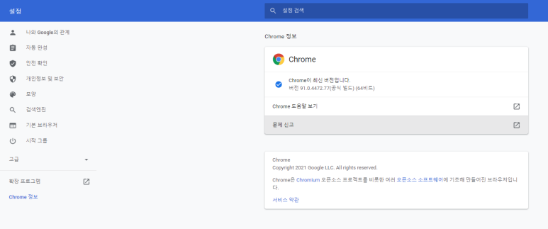 자신의 크롬버젼 확인 설정에서 chrome정보를 누르면 본인의 버젼을 확인할 수 있습니다.