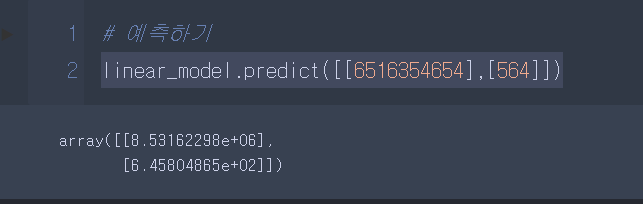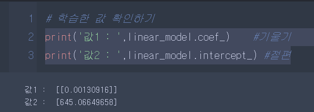 print('값1 : ',linear_model.coef_) #기울기 print('값2 : ',linear_model.intercept_) #절편