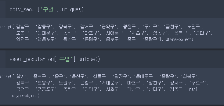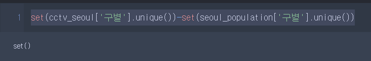 set(cctv_seoul['구별'].unique())-set(seoul_population['구별'].unique())