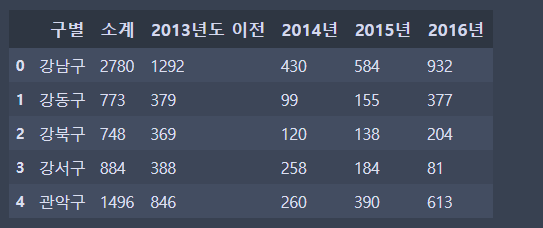 cctv_seoul변수에 담고 head()로 기본값인 상위 데이터 5개 출력