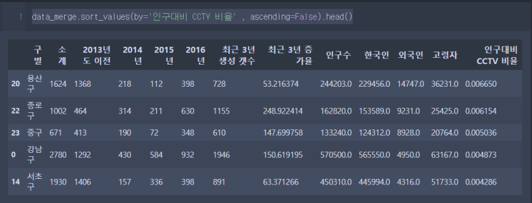 data_merge.sort_values(by = '인구대비 CCTV 비율', ascending=False, inplace =True)