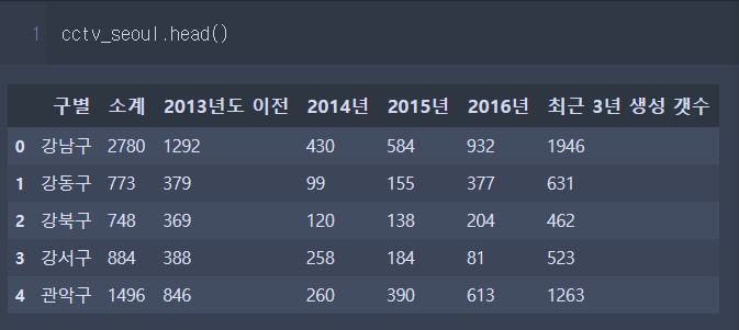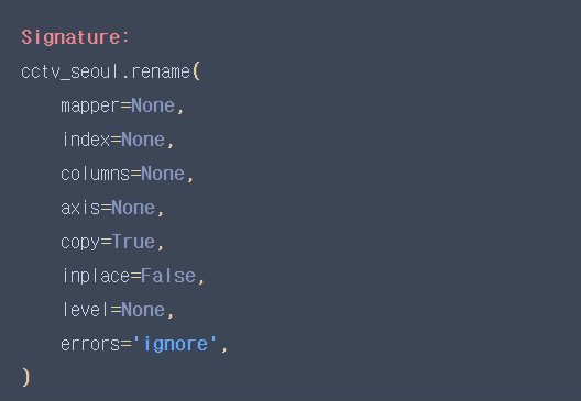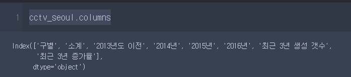 - cctv_seoul.rename(columns={cctv_seoul.columns[0]:"구별"}) 이건 출력만