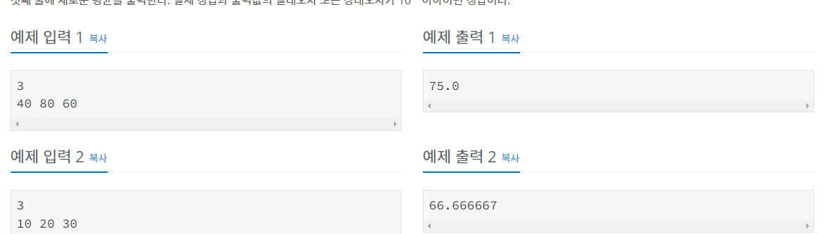 첫째 줄에 새로운 평균을 출력한다. 실제 정답과 출력값의 절대오차 또는 상대오차가 10-2 이하이면 정답이다.
