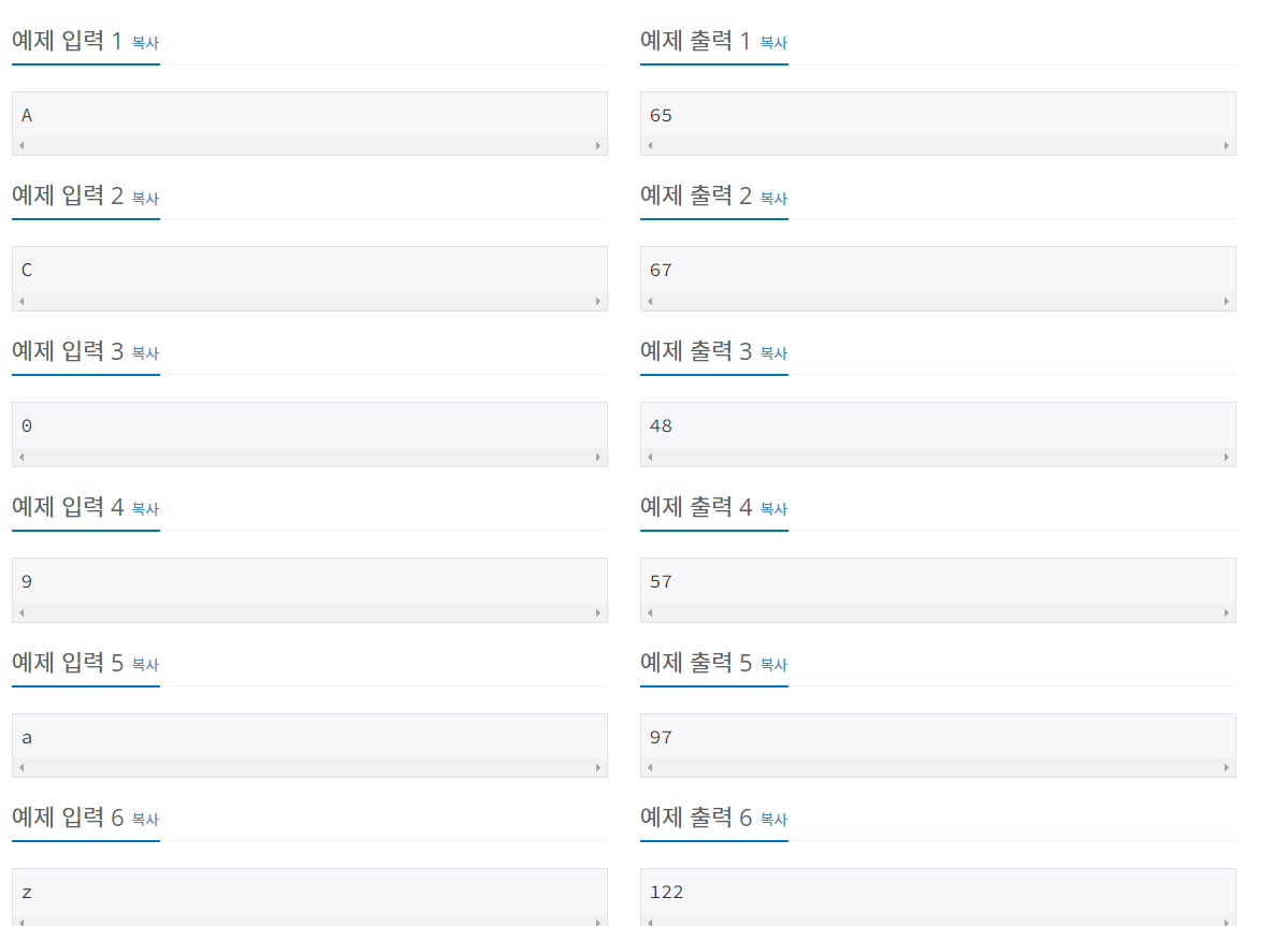 입력으로 주어진 글자의 아스키 코드 값을 출력한다.